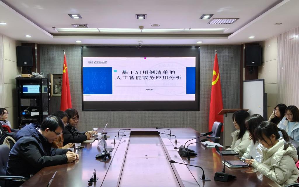 本次讲座以“基于AI用例清单的人工智能政务应用分析”为主题,邀请北京师范大学刘晓娟老师担任主讲,管理学院杨国庆副院长、管理学院老师赵俊玲教授以及学院相关专业师生积极参加。讲座主要围绕“AI+政务”、“政府职能部门的AI应用现状”、“美国政务AI用例清单分析”、“结论与启示”这四个部分展开。讲座结束后,赵俊玲老师对刘老师表达了感谢,并展开了交流环节,各位老师与参会学生就报告内容与专业学习展开深入交流。