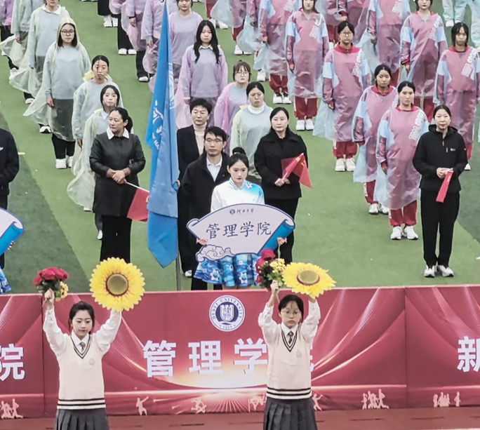 开幕式上,管理学院党委书记马洁、党委副书记张丽、副院长杨国庆、吴树芳参加了护旗方队。学院的方阵整齐划一,步伐矫健,同学们精神抖擞,口号响亮;花束队全程在场边挥舞着色彩斑斓的花束,为开幕式各方队加油助威,成为了运动会上一道亮丽的风景线,彰显着管院学子的自信与豪情,展现出无限活力与风采。