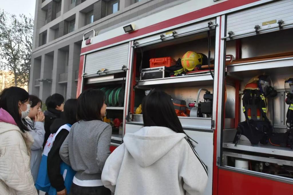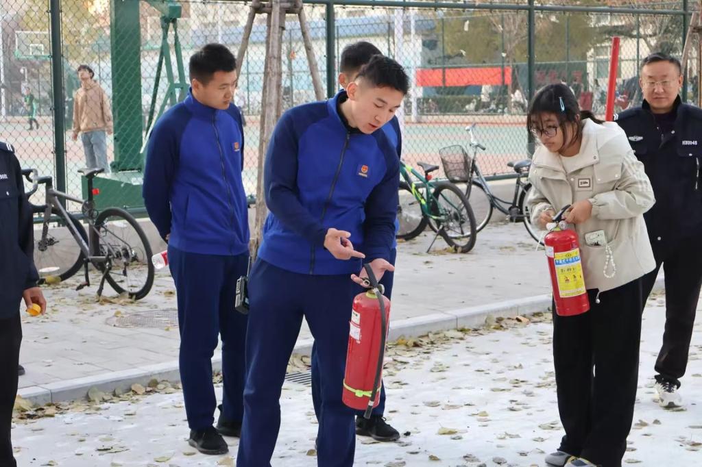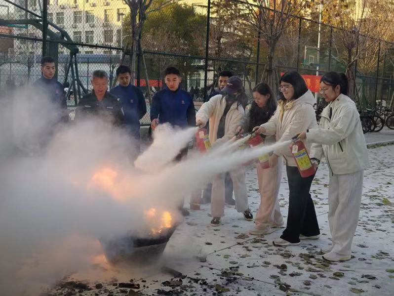 疏散演练结束后,东风路消防救援站工作人员随即开展消防安全知识宣讲。他们结合校园场景,系统讲解消防核心常识,重点针对宿舍电气火灾的常见隐患,给出具体预防建议与应急处置要点。同时,工作人员现场展示各类消防装备,通过细致说明其功能与适用场景,帮助师生深化对消防器材的认识。在实操区域,周新兵科长与消防队员共同指导实景灭火演练。消防队员率先示范灭火器“提、拔、握、压”的标准操作流程,着重强调对准火源根部、保持安全距离等关键安全事项。实操环节中,同学们踊跃参与,纷纷拿起灭火器亲身体验。尽管部分同学是初次操作略显紧张,但在现场指导下均顺利完成灭火操作,现场氛围热烈有序,大家纷纷表示,不仅真切掌握了灭火器的使用方法,更在模拟场景中学会了火灾突发时的冷静应对,消防意识得到了进一步提升,今后在校园里遇到类似突发情况,也能更有底气保护自己和身边人。