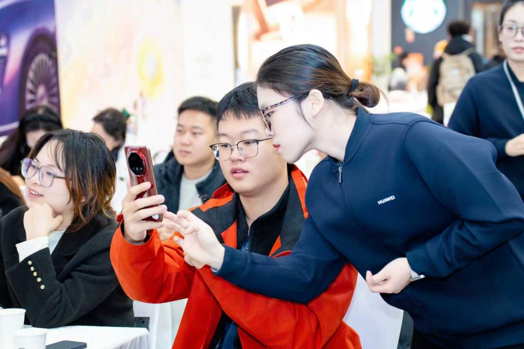 11月2日上午,学员们在华为慧通培训HR的带领下,走进万博广场华为体验店开展实地教学。大家近距离体验华为终端产品的创新功能,学习实用操作技巧与前沿科技知识。通过产品实操、趣味问答与手作创作等环节,同学们深度感知科技魅力。活动最后,主办方为积分领先的小组、个人及优秀手作学员颁发了定制奖品,现场洋溢着探索科技的热情与昂扬的求职信心。