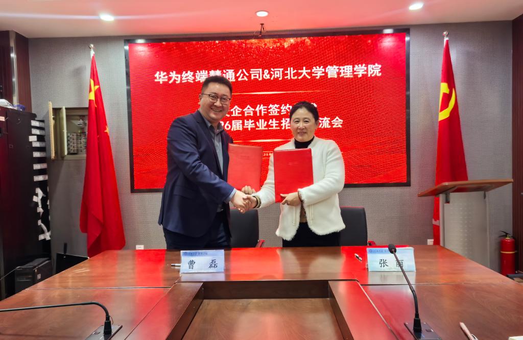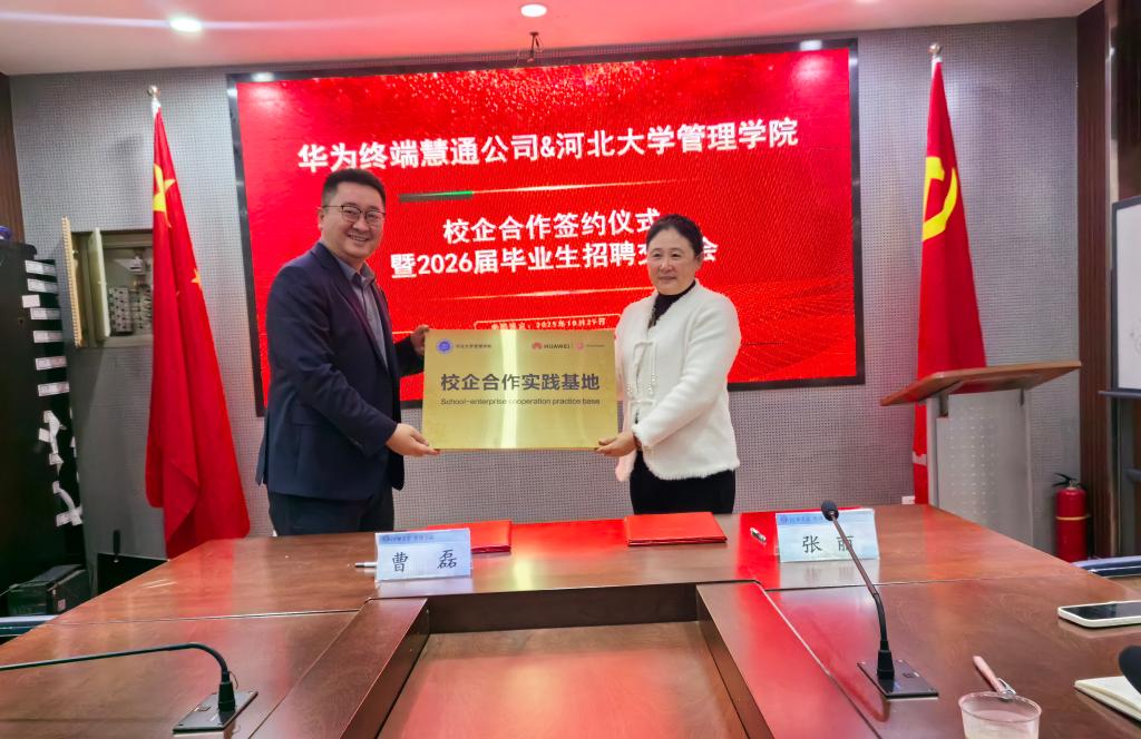 为深化人才培养与企业需求间的精准对接,全面提升学生就业核心竞争力,管理学院正式启动2025年“宏志助航”就业能力提升训练营——“河北大学-华为终端慧通校企合作班”。该项目由河北大学管理学院与华为终端深圳慧通商务有限公司联合打造,旨在构建一个贯通理论与实践的就业赋能平台,建立长期稳定的校企合作机制。10月29日,双方于河北大学七一路校区成功举办“校企合作实践基地”签约暨授牌仪式,标志着合作正式启航。